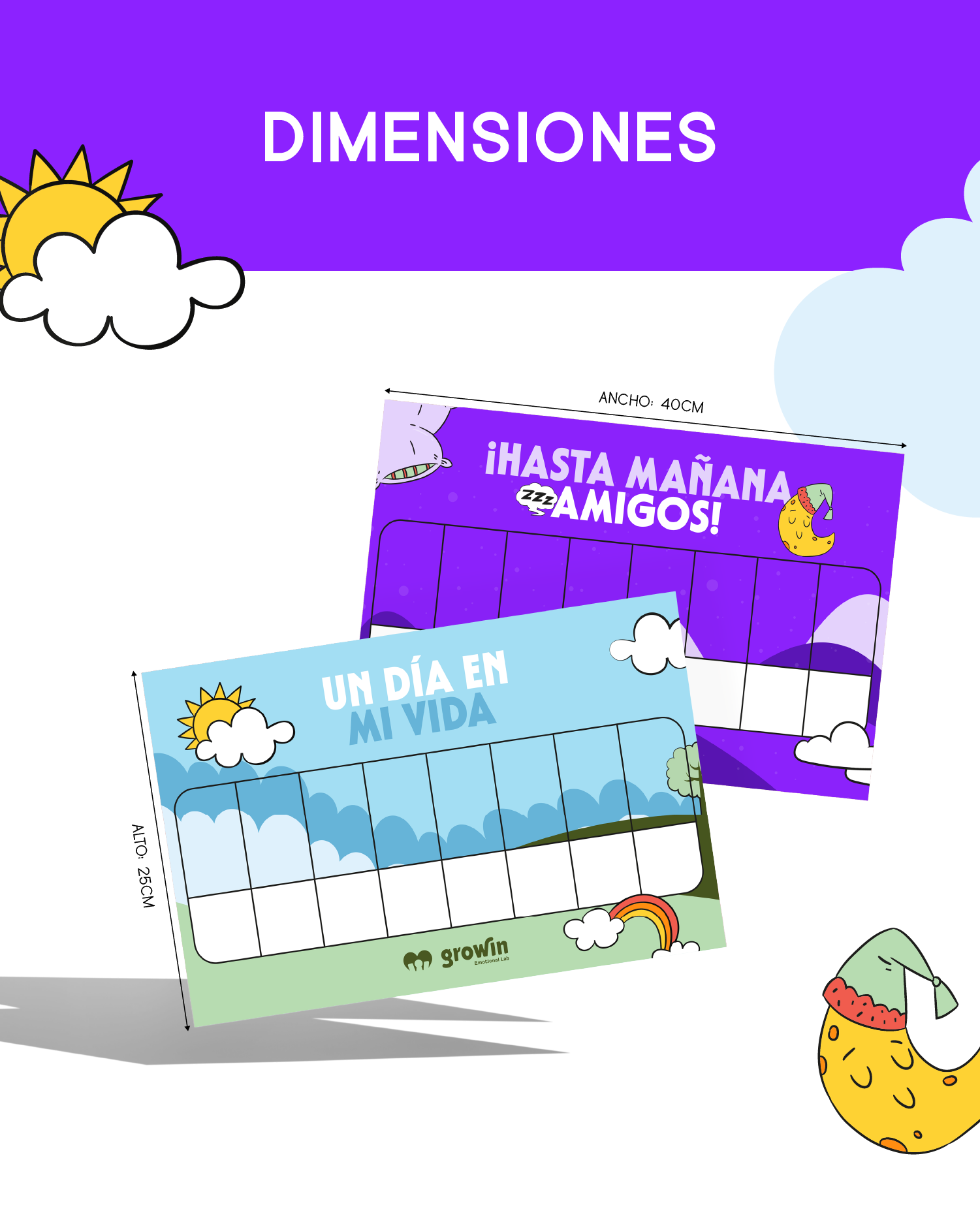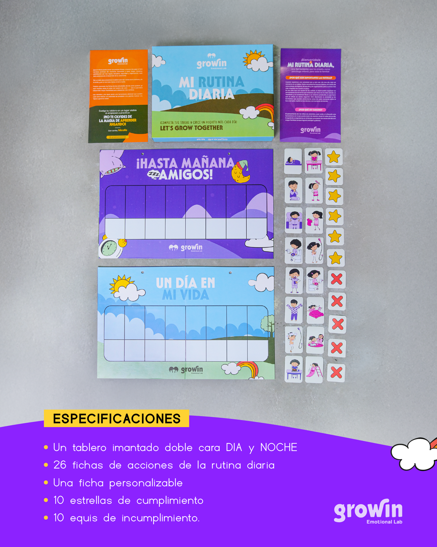 La caja contiene un tablero imantado doble cara, de un lado los espacios de la rutina del día, y del otro los de la noche. 26 fichas de acciones de la rutina diaria, y una ficha vacía por si quieres personalizar una de las rutinas. 10 estrellas de cumplimiento y 10 equis de incumplimiento.